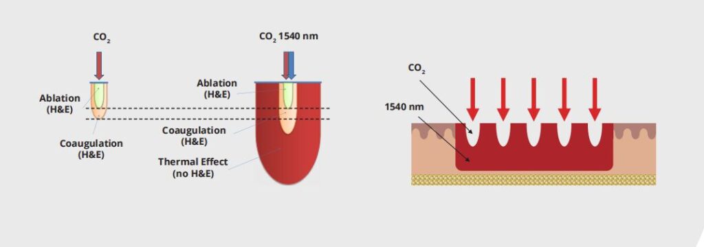Sức mạnh tổng hợp của hai bước sóng CO2 + 1540 nm giúp đạt được các điểm nhiệt liền kề mà không quang đông trên toàn bộ khu vực scanning và đạt được độ sâu đến lớp hạ bì – điều này không thể đạt được chỉ với các nguồn laser bóc tách. Hiệu ứng nhiệt đạt đến mức độ sâu tối đa hóa hoạt động kích thích mô và do đó đạt được phương pháp điều trị hiệu quả hơn và giảm thời gian lành thương.